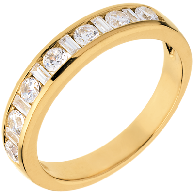 Eine gelbgoldene Kanalfassung hält 13 funkelnde Diamanten im Brillant- und Baguette-Schliff, ein edler Trauring. 13 Diamanten : 0.57 Karat - Gelbgold (750/-): 3.8 g. Weitere Abmessungen