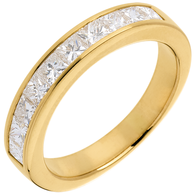Eine gelbgoldene Kanalfassung hält eine Reihe funkelnder Diamanten im Coussin-Schliff, ein edler Trauring. 10 Diamanten : 1 Karat - Gelbgold (750/-): 4.6 g. Weitere Abmessungen