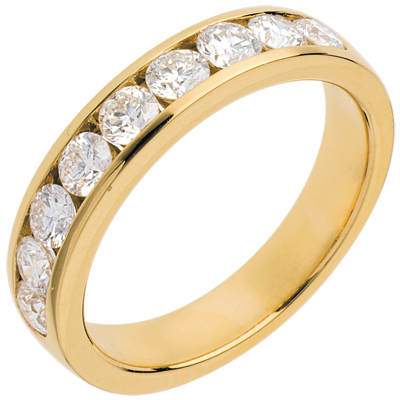 Eine gelbgoldene Kanalfassung hält 9 funkelnde Diamanten im Brillant-Schliff, ein edler Trauring. 9 Diamanten : 1 Karat - Gelbgold (750/-): 3.8 g. Weitere Abmessungen