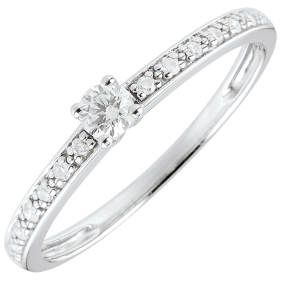 Dieser elegante und klassische Verlobungsring ist mit einem Diamanten in 4er Krappenfassung besetzt, welcher von funkelnden Brillanten umrandet ist. 15 Diamanten : 0.16 Karat - Weißgold (375/-): 1.3 g. Weitere Abmessungen