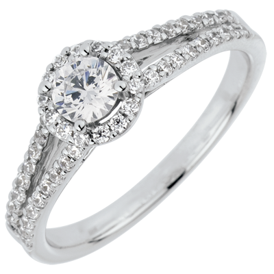 Ein erlesener Solitärdiamant wird von einem Kranz mit doppeltem Brillantpavé eindrucksvoll geschmückt. 51 Diamanten : 0.6 Karat - Weißgold (750/-): 3 g. Weitere Abmessungen