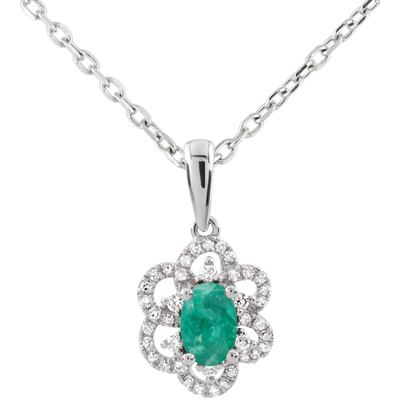 Eine köngliche Margerite, reicht verziert mit Diamanten und einem prächtigen Smaragd. Ohne Kette. 46 Diamanten : 0.17 Karat - Weißgold (375/-): 0.8 g. Smaragd : 1 - Total: 0.43 Karat Weitere Abmessungen