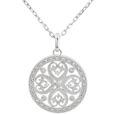 Raffinesse, Weiblichkeit und Unendlichkeit beschreiben dieses Schmuckstück. In seinem inneren trägt dieser Anhänger ein romantisches Kleeblatt aus Gold und Diamanten. Ohne Kette. 37 Diamanten : 0.22 Karat - Weißgold (375/-): 2.9 g. Weitere Abmessungen