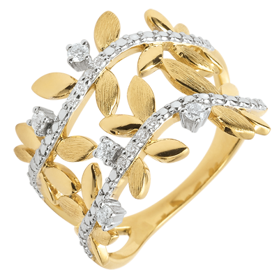 Ring Verzauberter Garten - Zweifach Königliches Blattwerk - Gelbgold und Diamanten - 18 Karat