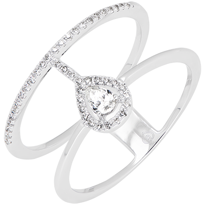 Die Krone eines Diamanten in Tropfenform, welche auf einem zweifachen Ringrahmen thront - ein schmaler und eleganter Ring.