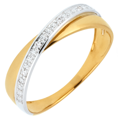 Ein gelbgoldener Ring wird auf elegante Weise von einem brillantbesetzten Band in Weißgold durchquert. 4 Diamanten : 0.02 Karat - Weiß-und Gelbgold (750/-): 2 g. Weitere Abmessungen