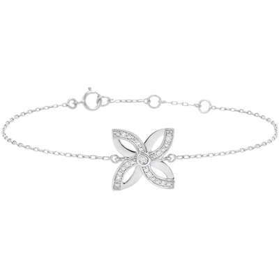 Eine feine Lilie in edlem Weißgold wird, mit erlesenen Diamanten besetzt, von einem zarten Armkettchen gehalten. Längenverstellbares Armband: 18, 17 und 16 Zentimeter. Motivmaße: 12mm Länge und 12mm Höhe. 9 Diamanten : 0.04 Karat - Weißgold (375/-): 1.1 g. Weitere Abmessungen