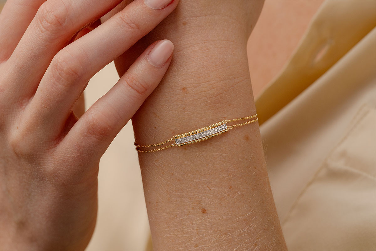 Zwei Reihen aus gelbgoldenen Perlen umrahmen ein emporgehobenes Pavé aus Gold und Diamanten. Das Motiv wird durch zwei zarte Kettchen, die zu Einer zusammenfließen, besonders elegant zur Geltung gebracht. Längenverstellbares Armband: 18, 17 und 16 Zentimeter. Motivmaße: 21mm Länge und 5 mm Breite. 4 Diamanten : 0.04 Karat - Gelbgold (375/-): 1.8 g. Weitere Abmessungen