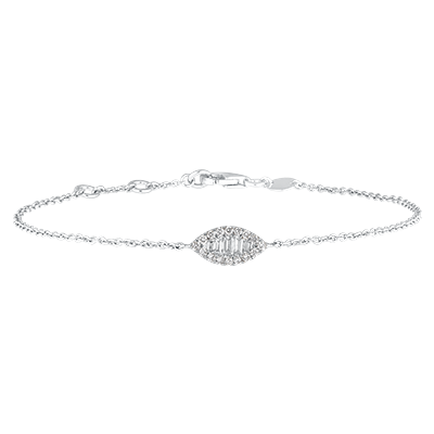 Ein feines, feminines Armband mit Formen, die sich von orientalischen Märchen inspirieren. Das Motiv der Weißgoldkette aus fünf Baguette-Diamanten wird durch das Diamanten-Pavé in Mandelform zart hervorgehoben. Längenverstellbares Armband: 18cm, 17cm, 16cm. 21 Diamanten : 0.21 Karat - Weißgold (375/-): 1.4 g. Weitere Abmessungen