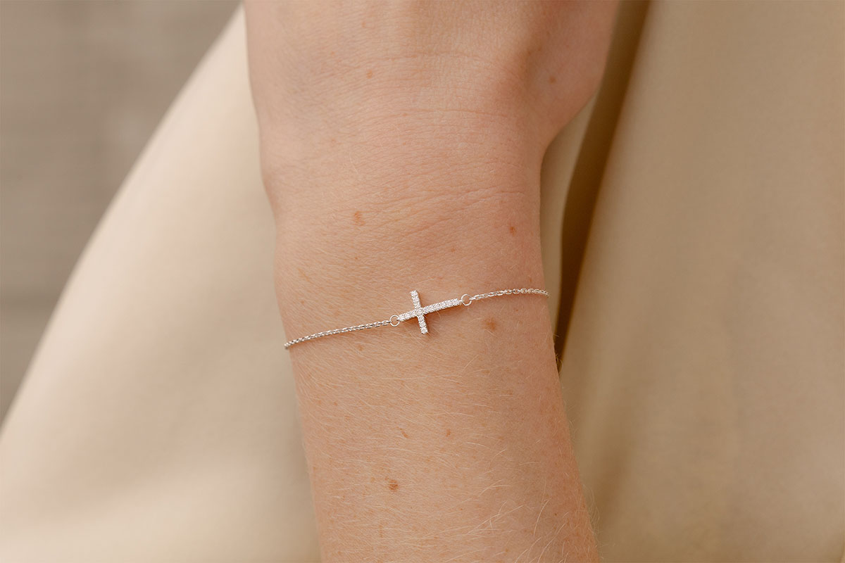 Glitzernde Diamanten gerahmt in ein zartes Armband Kreuz aus Weissgold, ein diskretes und raffiniertes Schmuckstück. Motivbreite: 11.5 mm, Motivhöhe: 8 mm. Armband mit verstellbarer Länge: 18 cm, 17 cm, 16 cm. 16 Diamanten : 0.08 Karat - Weißgold (750/-): 1.8 g. Weitere Abmessungen