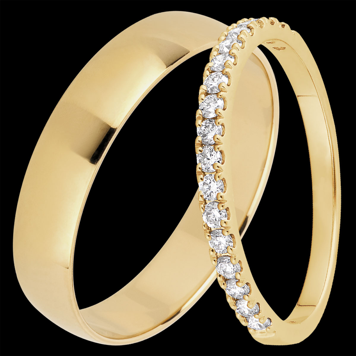 Ein elegantes Trauringpaar für Sie & Ihn. Ein halb mit 18 Diamanten (insgesamt 0,26 Karat) besetzter Ring für Sie, ein schmaler, polierter Gelbgoldring (4 mm breit) für Ihn. Gelbgold (375/-): 0 g.Weitere Abmessungen