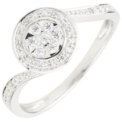 Eine Blume aus 7 Diamanten wird im Zentrum einer glanzvollen Fassung eingefasst. 15 Diamanten : 0.11 Karat - Weißgold (750/-): 2.5 g. Pavé aus natürlichen Diamanten : 15 - Total: 0.11 Karat Weitere Abmessungen
