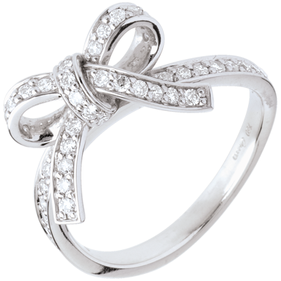 Eine diamantbesetzte Schleife, die sich funkelnd um den Finger schmiegt. Dieser liebliche Ring verkörpert Süsse und Unschuld. 47 Diamanten : 0.42 Karat - Weißgold (750/-): 3.6 g. Weitere Abmessungen