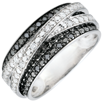 Dieser wunderschöne Ring in Weißgold aus der Dämmerschein-Kollektion, ist mit sechs weißen und acht schwarzen Diamanten besetzt, die ihn raffiniert und anmutig zugleich wirken lassen. 6 Diamanten : 0.05 Karat - Weißgold (750/-): 6.4 g. Diamant : 6 - Schwarzer Diamant : 8 - Total: 0.072 Karat Weitere Abmessungen