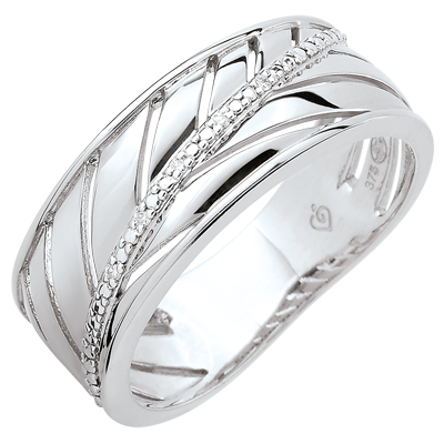 Ein breiter Ring in Weißgold, der seine Inspiration aus der Leichtigkeit eines Palmenblattes schöpft. Sein Hauptstrang ist mit einer Vielzahl kleiner Diamanten verziert. Ein Ring, den man sowohl jeden Tag, als auch zu besonderen Anlässen tragen kann. 5 Diamanten : 0.02 Karat - Weißgold (750/-): 4.8 g. Weitere Abmessungen