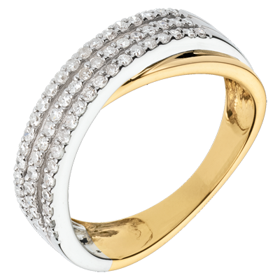 Ein glamouröser Ring aus Weissgold, besetzt mit drei Diamantenreihen, wird von einem zarten Gelbgoldring begleitet. 60 Diamanten : 0.36 Karat - Weiß-und Gelbgold (750/-): 4 g. Weitere Abmessungen