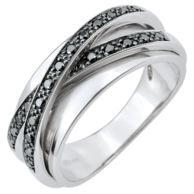 Eine kunstvolle Verschlingung von Weißgoldringen, ganz mit funkelnden schwarze Diamanten besetzt. Weißgold (375/-): 4.1 g. Schwarzer Diamant : 23 - Total: 0.207 Karat Weitere Abmessungen