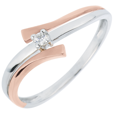 Ein erlesener Diamant wird sorgfältig von vier Krappen in Weißgold gehalten und posiert auf einer dynamischen Fassung in Weiß- und Roségold.