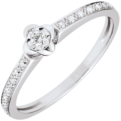 Eine zarte Blume, welche mit einem erlesenen Solitärdiamanten geschückt ist, posiert sanft auf einem diamantbesetzten Ring - Ein romantischer und zeitgenössischer Verlobungsring. Zentrierter Diamant: 0.03 Karat. 15 Diamanten : 0.09 Karat - Weißgold (375/-): 1.3 g. Weitere Abmessungen