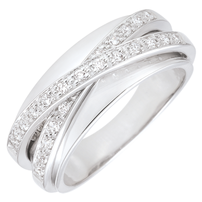 Eine kunstvolle Verschlingung von Weißgoldringen, ganz mit funkelnden Diamanten besetzt. 23 Diamanten : 0.21 Karat - Weißgold (375/-): 4.2 g. Weitere Abmessungen