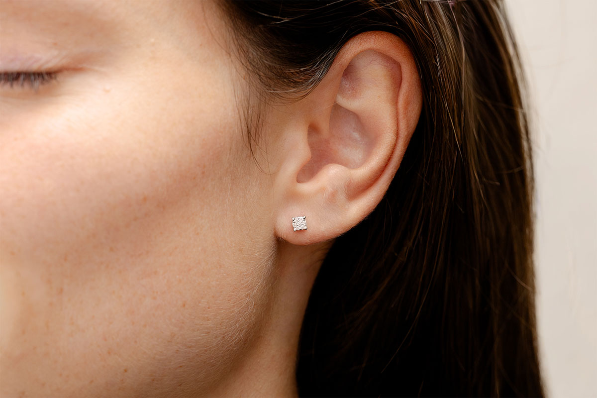 Eine Myriade aus Diamanten, wie die Sterne im Rendez-vous, bildet einen Schwungvollen Solitär, der sich auf jedem Ohrring ablehnt.