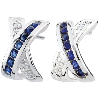 Ein Kreuz in Weißgold, besetzt mit Diamanten und Saphiren formt sich zu einer Halbcreole. 2 Diamanten : 0.01 Karat - Weißgold (375/-): 1.4 g. Blauer Saphir : 14 - Total: 0.32 Karat Weitere Abmessungen