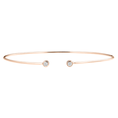 Ein dünner, eleganter Armreif mit zwei zarten Diamanten. Kann alleine oder kombiniert mit der Weißgold- und Gelbgoldausführung getragen werden. 2 Diamanten : 0.09 Karat - Rotgold (750/-): 3.1 g. Weitere Abmessungen