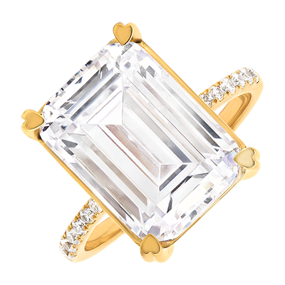 Ein skulpturales, reines Schmuckstück: Der Célestia Ring aus recyceltem Gelbgold präsentiert einen majestätischen, smaragdgeschliffenen, synthetischen Diamanten von 10 Karat, der durch ein filigran ausgefasstes Band kunstvoll in Szene gesetzt wird.Außergewöhnliches Strahlen – für Frauen, die Licht kompromisslos in ihr Leben lassen.