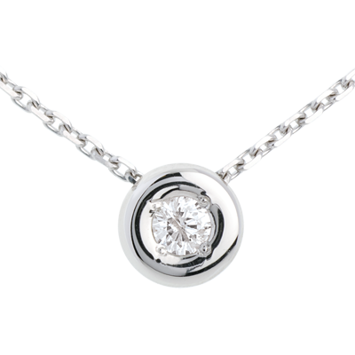 Ein funkelnder Diamant lieblich eingefasst in einen zarten Rahmen aus Weissgold. Mit Goldkette 750/1000: 40 cm. Mit Kette 42 cm + Verlängerung von 3 cm; 750/-. 1 Diamant : 0.1 Karat - Weißgold (750/-): 2 g. Weitere Abmessungen