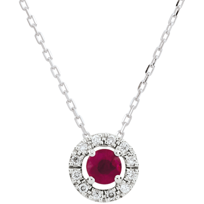 Ein mit Diamanten besetzter Kreis lässten einen Rubin erstrahlen. Mit Kette 42 cm + Verlängerung von 3 cm; 375/-. 12 Diamanten : 0.07 Karat - Weißgold (375/-): 1.7 g. Rubin : 1 - Total: 0.37 Karat Weitere Abmessungen