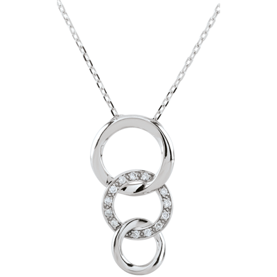 Eine Kreistrilogie in unendlicher Bewegung - im inneren mit Diamanten besetzt. Mit Kette 42 cm + Verlängerung von 3 cm; 750/-. 13 Diamanten : 0.06 Karat - Weißgold (750/-): 3 g. Weitere Abmessungen