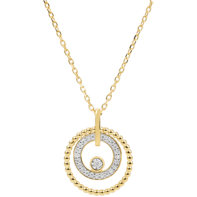 Eine Vielzahl kleiner Goldperlen umrandet auf elegante Weise einen Kranz aus erlesenen Diamanten und birgt einen umwerfenden Solitär in seiner Mitte. Mit Kette 42 cm + Verlängerung von 3 cm; 375/-. 7 Diamanten : 0.03 Karat - Gelbgold (375/-): 2.4 g. Weitere Abmessungen