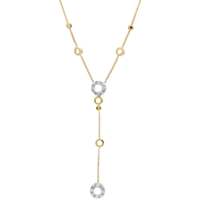 Ein Duo aus Weißgold und Gelbgold für die Moderne, Diamanten für die Raffinesse und Kreise für die Zeitlosigkeit. Mit Kette 42 cm + Verlängerung von 3 cm; 375/-. 8 Diamanten : 0.03 Karat - Weiß-und Gelbgold (375/-): 1.9 g. Weitere Abmessungen