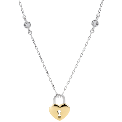 Ein zartes Herz in Gelbgold, welches ein geheimnisvolles Schloss in seiner Mitte trägt, ist mit zwei erlesenen Brillanten geschmückt und wird von einer edlen Kette in Weißgold gehalten. Mit Kette 42 cm + Verlängerung von 3 cm; 375/-. 2 Diamanten : 0.01 Karat - Weiß-und Gelbgold (375/-): 2.1 g. Weitere Abmessungen