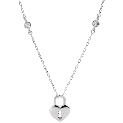 Ein zartes Herz in Weißgold, welches ein geheimnisvolles Schloss in seiner Mitte trägt, ist mit zwei erlesenen Brillanten geschmückt und wird von einer edlen Kette, ebenfalls in Weißgold, gehalten. Mit Kette 42 cm + Verlängerung von 3 cm; 375/-. 2 Diamanten : 0.01 Karat - Weißgold (375/-): 2.1 g. Weitere Abmessungen