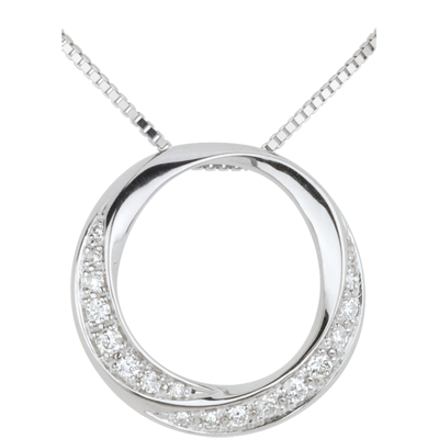 Ein dynamisches Zusammenspiel von Weißgold und Diamanten, ein wunderschöner Rahmen für das Gesicht einer Frau. Mit Goldkette 42 cm 750/-. Mit Kette 42 cm + Verlängerung von 3 cm; 750/-. 18 Diamanten : 0.17 Karat - Weißgold (750/-): 3.3 g. Weitere Abmessungen