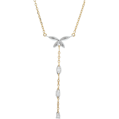 Ein zartes Blattwerk mit drei hängenden Diamanten. Mit Kette 42 cm + Verlängerung von 3 cm; 375/-. 3 Diamanten : 0.06 Karat - Weiß-und Gelbgold (375/-): 1.7 g. Weitere Abmessungen