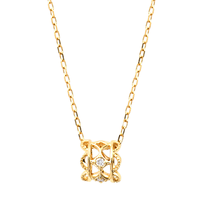 Ein filigran gearbeitetes goldenes Geflecht, veredelt durch drei funkelnde Diamanten.Ein edles Schmuckstück mit floraler Eleganz – Harmonie aus Poesie und strahlender Raffinesse. Mit Kette 42 cm + Verlängerung von 3 cm; 375/-. Gelbgold (375/-): 2.1 g. Labordiamant : 3 - Total: 0.06 Karat Weitere Abmessungen