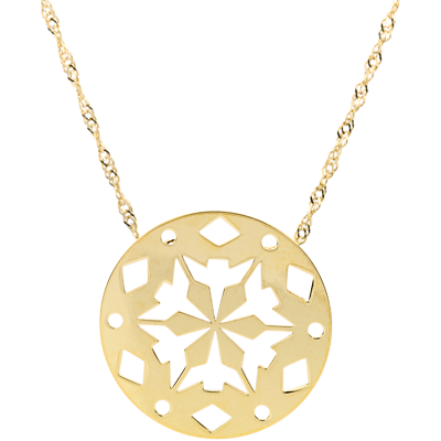 Ein blumiges Muster, das an indianische Webkunst erinnert - gestanzt in eine Scheibe aus Gold.