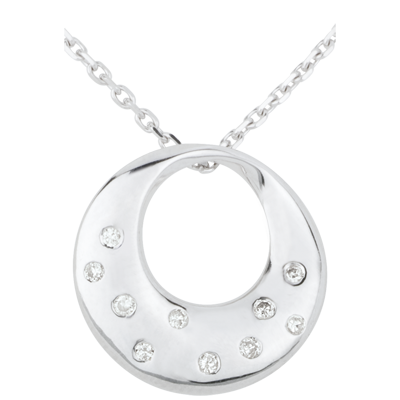 Ein kreisförmiger Anhänger aus Weißgold, gespickt mit Diamanten, wird an einer zarten Gliederkette gehalten. Mit Goldkette 750/-. Mit Kette 42 cm + Verlängerung von 3 cm; 750/-. 10 Diamanten : 0.1 Karat - Weißgold (750/-): 3.3 g. Weitere Abmessungen