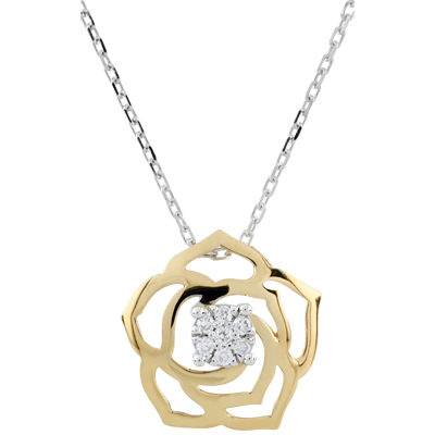 Die Konturen einer Rose, welche in ihrem Inneren ein Herz aus erlesenen Diamanten birgen. Mit Kette 42 cm + Verlängerung von 3 cm; 375/-. 7 Diamanten : 0.06 Karat - Weiß-und Gelbgold (375/-): 2.1 g. Pavé aus natürlichen Diamanten : - Weitere Abmessungen