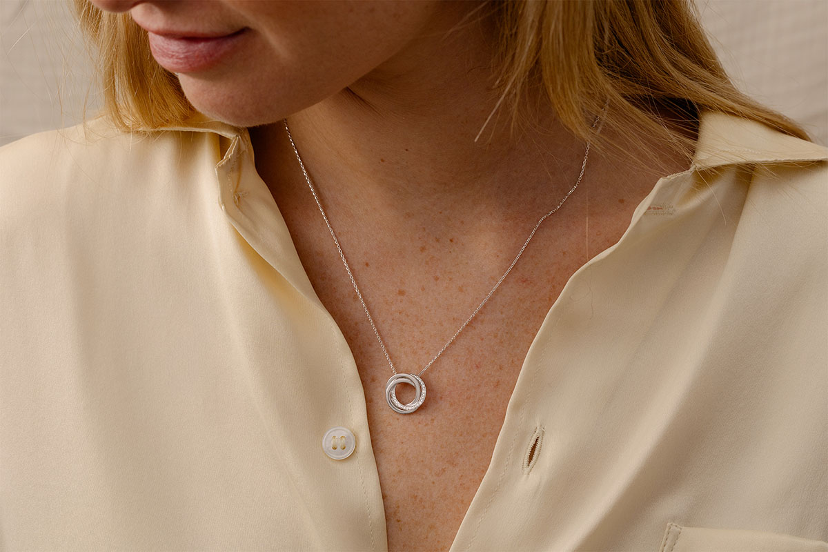Die Besonderheit dieses einzigartigen Colliers rührt aus der harmonischen Verbindung von drei Ringen in Weißgold, die von einem diamantbesetztem Band durchquert werden.