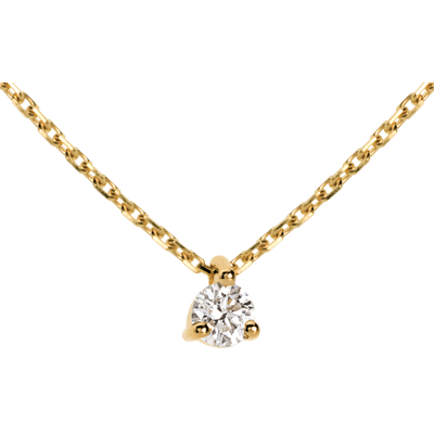 Der funkelnde Diamant in einer 3er Krappenfassung aus Gelbgold verkörpert zarte Eleganz. Mit Goldkette 750/1000. Mit Kette 42 cm + Verlängerung von 3 cm; 750/-. 1 Diamant : 0.16 Karat - Gelbgold (750/-): 1.4 g. Weitere Abmessungen
