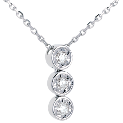 Diese funkelnde Trilogie unterstreicht dezent das Dekolleté. Mit Goldkette 40cm 750/1000. Mit Kette 42 cm + Verlängerung von 3 cm; 750/-. 3 Diamanten : 0.12 Karat - Weißgold (750/-): 2.4 g. Weitere Abmessungen