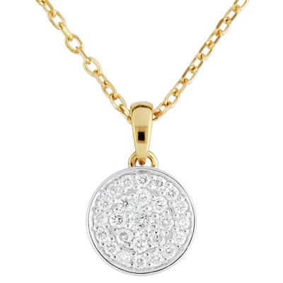 Eine Konstellation von Diamanten, geballt an einem Anhänger, der in vollem Glanze funkelt. Mit Kette von 42cm Länge und 3cm Verlängerung. Mit Goldkette 750/-. Mit Kette 42 cm + Verlängerung von 3 cm; 750/-. 25 Diamanten : 0.16 Karat - Weiß-und Gelbgold (750/-): 2.5 g. Pavé aus natürlichen Diamanten : 25 - Total: 0.163 Karat Weitere Abmessungen