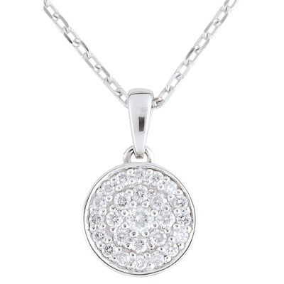 Eine Konstellation von Diamanten, geballt an einem Anhänger, der in vollem Glanze funkelt. Mit Kette von 42cm Länge mit 3cm Verlängerung. Mit Goldkette 375/-. Mit Kette 42 cm + Verlängerung von 3 cm; 375/-. 25 Diamanten : 0.16 Karat - Weißgold (375/-): 1.9 g. Pavé aus natürlichen Diamanten : 25 - Total: 0.163 Karat Weitere Abmessungen