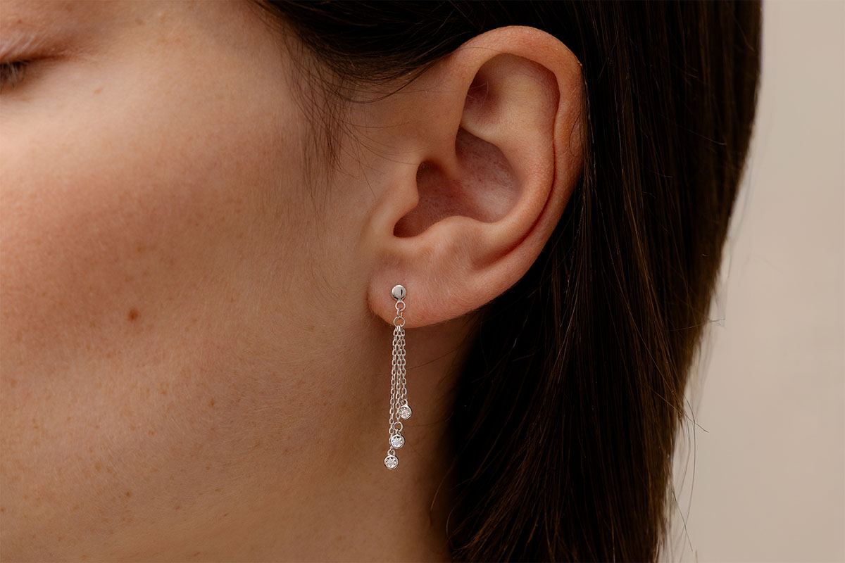 Ein Wasserfall aus Diamanten, gehalten von drei Ketten aus Weißgold.6 Diamanten : 0.04 Karat - Weißgold (750/-) : 1.10 g.
