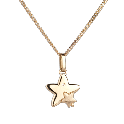 Ein großer Stern umarmt seinen kleinen Schützling. Ein Diamant verziert einen seiner gelbgoldenen Spitzen. Kleines Modell.