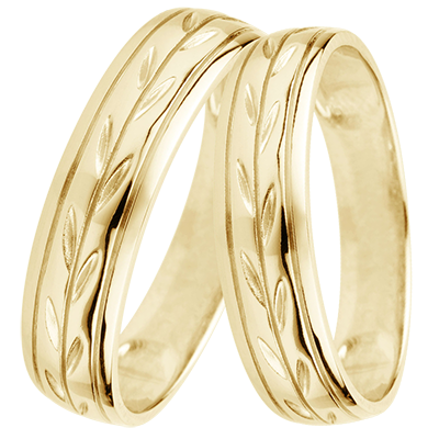Ein breiter Trauring in Gelbgold, welcher zart von einer zeitlosen Blättergravur geprägt ist.