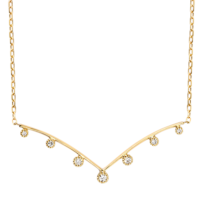 Sieben Diamanten schweben leicht an einer filigranen goldenen Linie.Ein zart gefertigtes Collier, das modernes Gleichgewicht mit dezentem Glanz vereint. Mit Kette 42 cm + Verlängerung von 3 cm; 375/-. Gelbgold (375/-): 1.5 g. Labordiamant : 7 - Total: 0.18 Karat Weitere Abmessungen